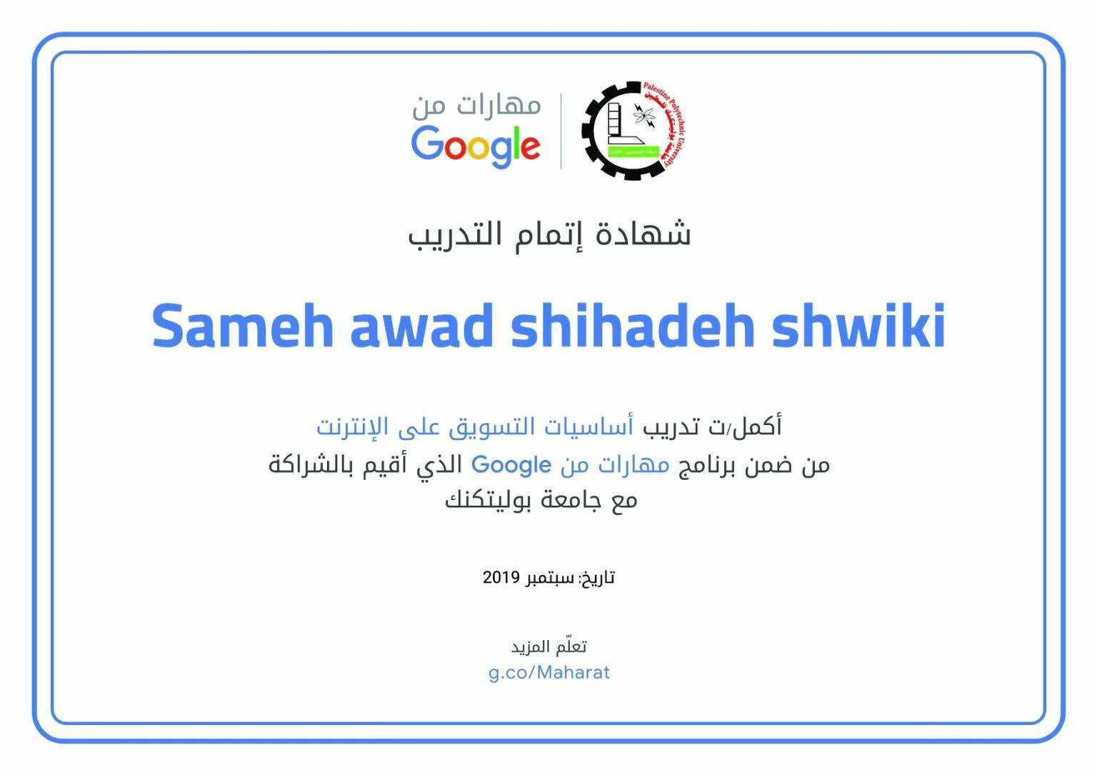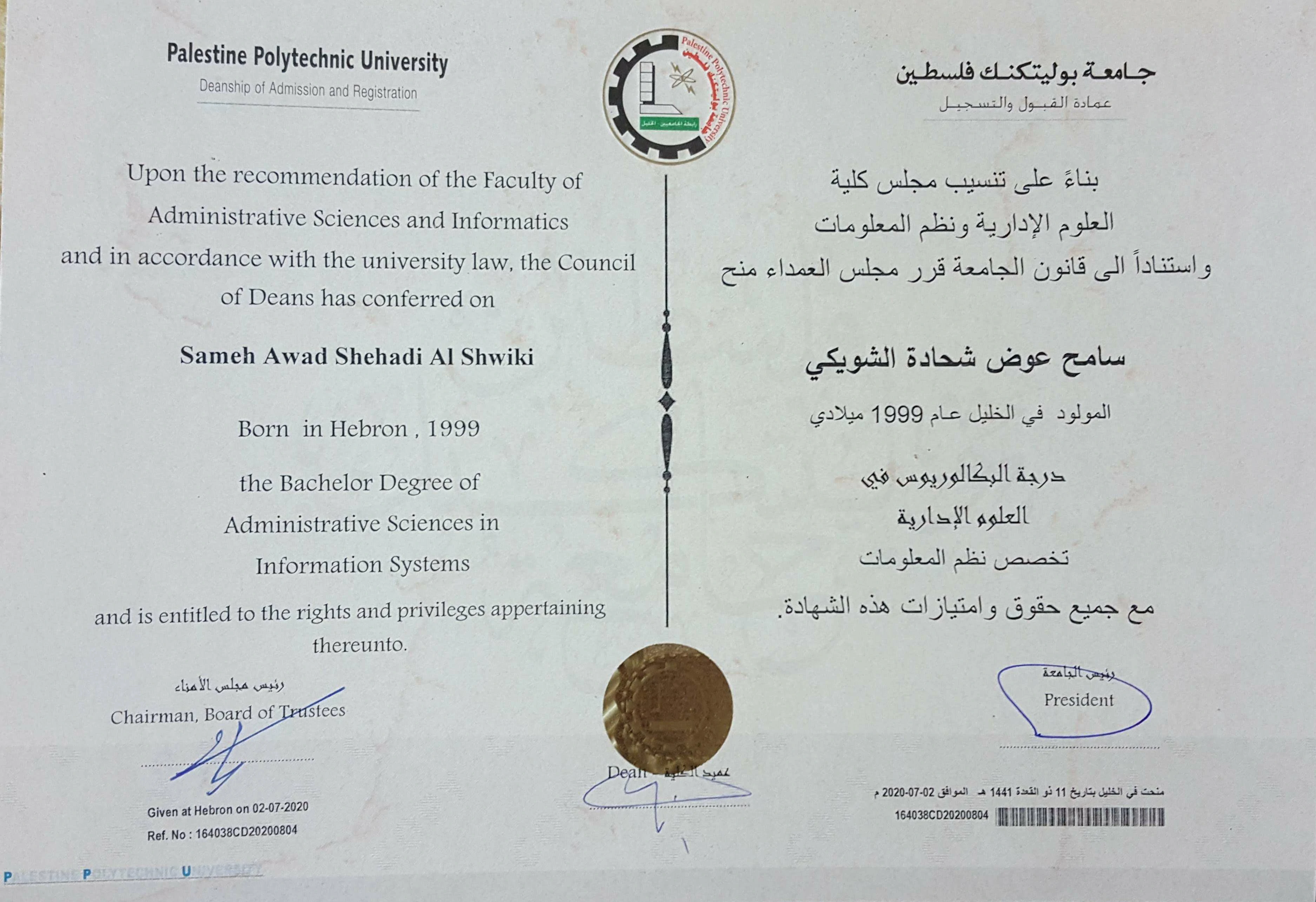 Hello, I am Sameh Shwiki from Hebron-Palestine. I obtained my bachelor's degree in information systems from Palestine Polytechnic University in 2016-2020.